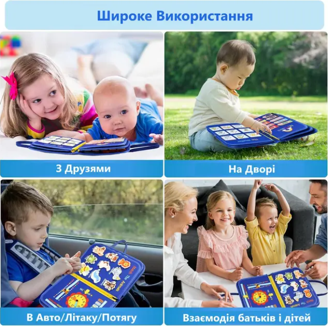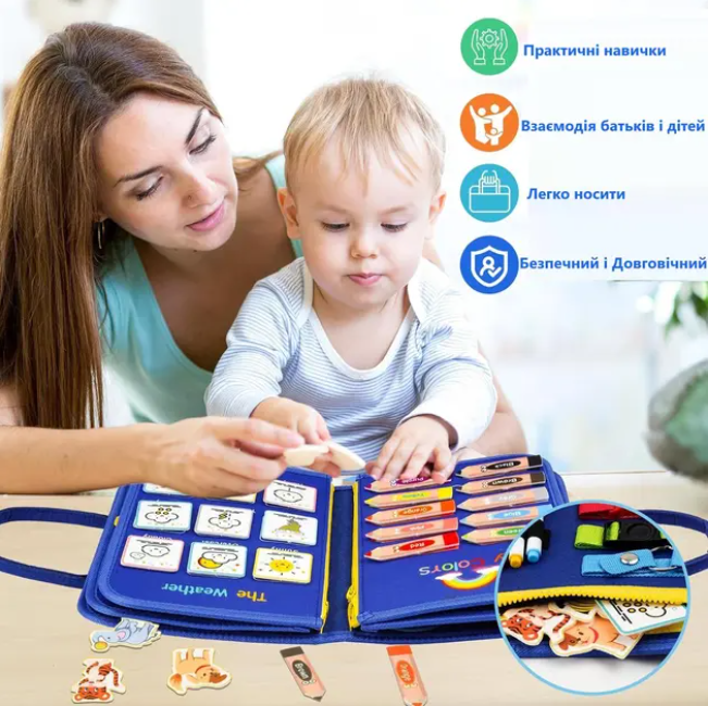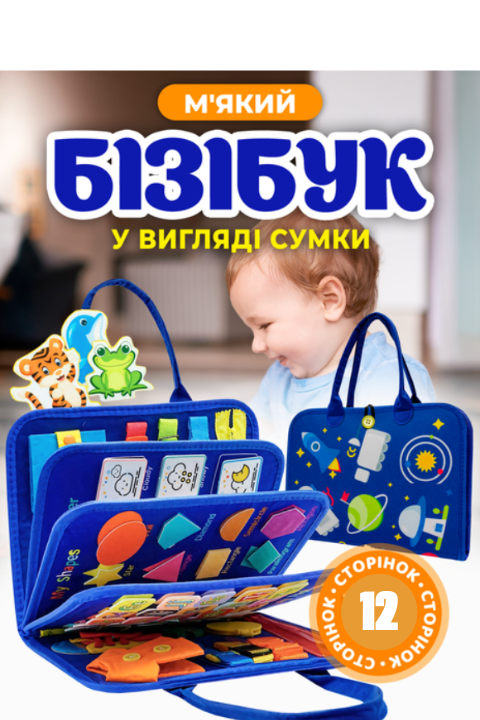 Бизиборд — тактильна м’яка розвивальна книга Монтессорі у вигляді сумочки — це інноваційна інтерактивна іграшка для дітей, яка поєднує навчання, гру та розвиток дрібної моторики.